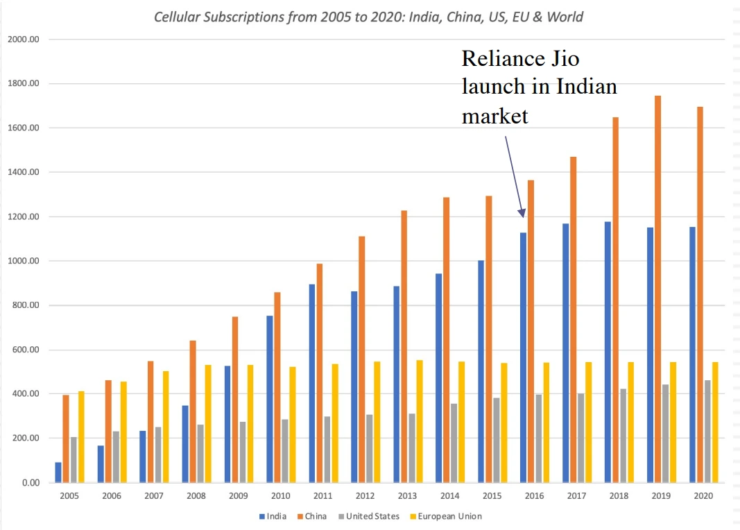 2. 이동통신서비스 비용 감소: 2016년 '지오(Jio)'라는 통신기업이 시장에 진입. 통신서비스 비용을 급격하게 떨어뜨리며, 빠르게 1억 명의 가입자를 확보했다(현재는 4억 명).
