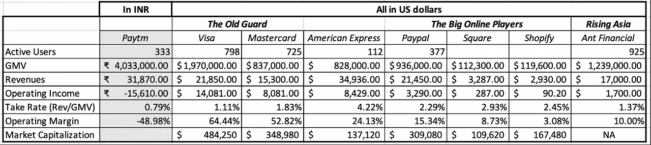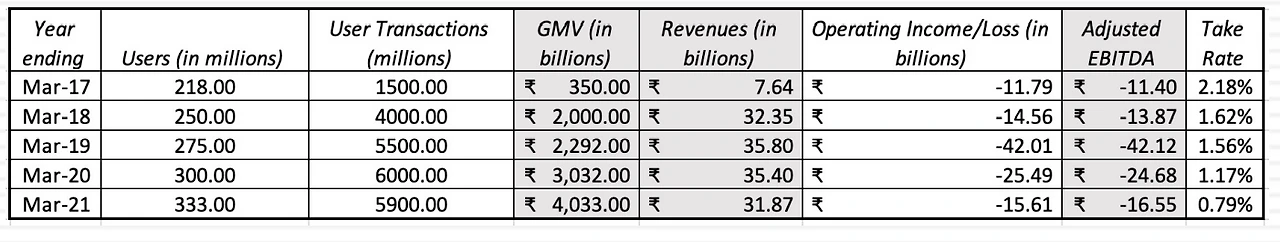 6가지의 주요 수치들로 페이티엠의 현황을 보자. 페이티엠은 성장기업일까? 유저수(Users)와 거래수(User transactions) 그리고 총판매량(GMV)을 기준으로 생각한다면 맞다. 하지만 매출액(Revenues)과 수익성(Operating income)을 기준으로 한다면 성장성은 찾기 힘들다.
