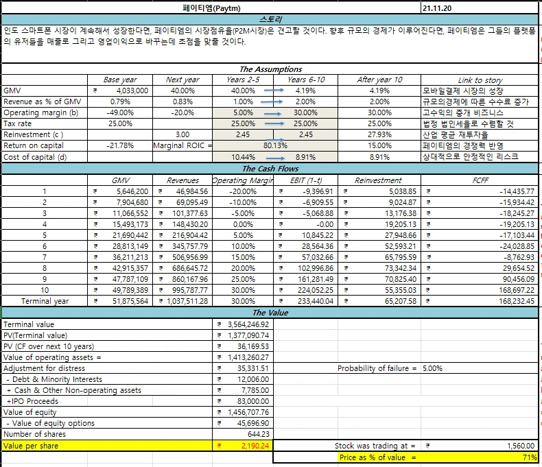 결론적으로 페이티엠 주식 가격은 2,190루피였고, 현재 가격은 1560루피였다. 내가 생각한 페이티엠의 가치보다 현재 페이티엠 주가가 29% 저렴한 것으로 확인됐다.