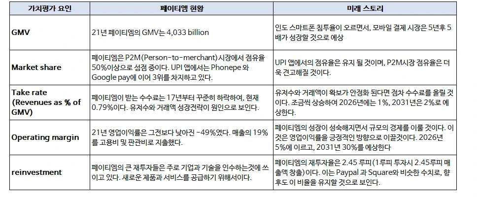 페이티엠의 가치평가에 가장 중요한 요인은 크게 5가지이다. 이 요인들의 현황을 확인하고, 이를 바탕으로 미래 페이티엠의 스토리를 만들어 볼 것이다. 그 후 만들어진 스토리를 수치로 변환하여, 페이티엠의 주가를 구해볼 것이다.