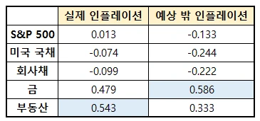 숫자가 1에 가까울수록 상관관계가 높은, 즉 움직이는 방향이 비슷한 것이다(하나가 상승(하락)하면 같이 상승(하락)하는 것). 금과 부동산이 인플레와 가장 상관관계가 높았고, 특히 예상 밖 인플레에는 금이 그리고 실제 인플레에는 부동산이 좋았다. 주식은 모두 상관관계가 낮었다.