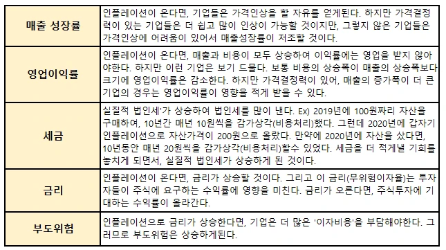 인플레이션이 발생하면 주식에는 어떠한 영향을 줄 것인가? 주식가치에 영향을 미치는 5가지 요인을 기준으로 확인할 수 있다.