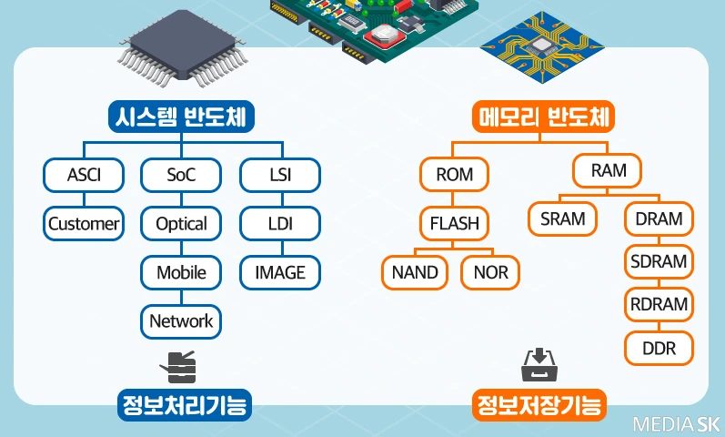 이러한 반도체는 쓰임에 따라서 크게 2가지(메모리와 비메모리)로 구분되며,글로벌 반도체 시장에서 메모리의 비중이 30%, 비메모리가 70%를 차지하고 있다.