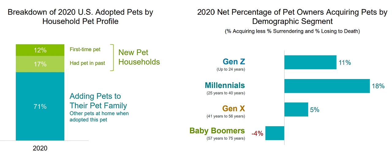 또한 2020년 미국에서 신규로 반려동물을 입양한 사람들 중, 이미 반려동물이 있지만 추가로 입양한 비율이 71%로 나타났다. 이만큼 반려동물을 키움으로써 얻는 만족감이 높다는 것을 알 수 있죠. 특히 MZ세대의 '순 입양 수치(=신규 입양- 키우기를 포기- 사망)'는 다른 세대보다 앞도적으로 높은 것을 확인할 수 있다.