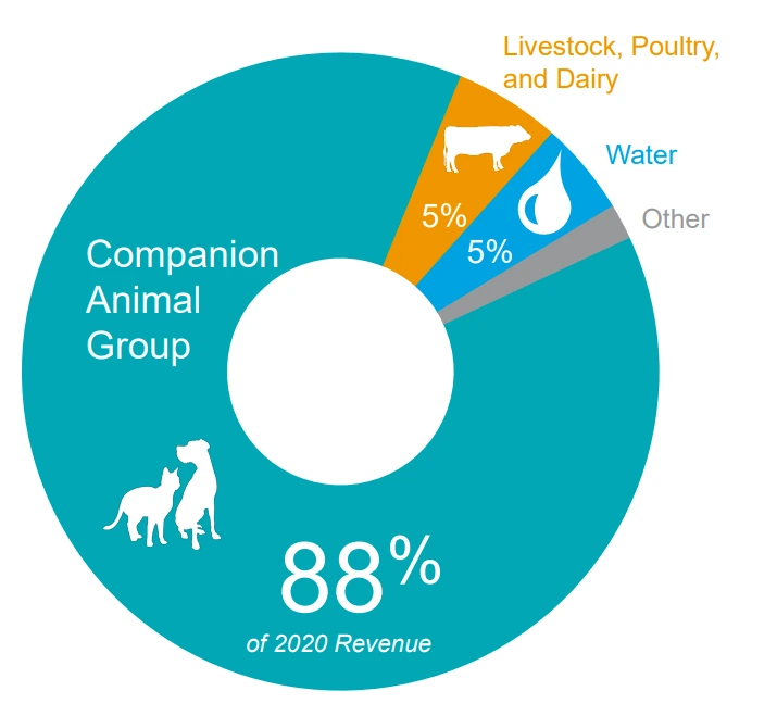 전체 매출 비중 중 약 90%를 반려동물 관련 사업이 차지하고 있으며, 나머지 10%는 가축과 수질검사가 차지하고 있다.