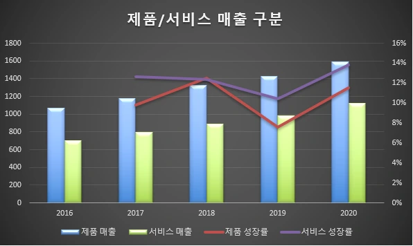 근소하게 서비스 부문 성장률이 기기 판매보다 앞서고 있음.