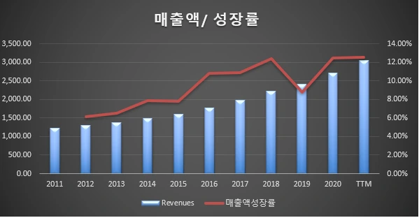 이전 10년 연평균 9%의 매출액 성장률을 보여주고 있음.