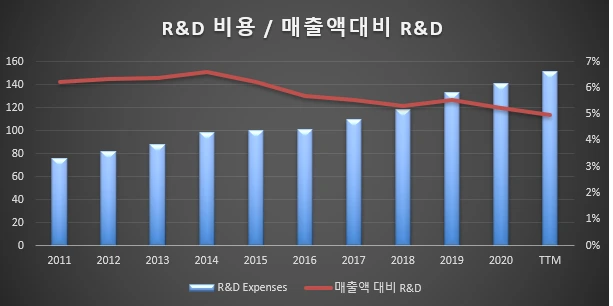 매출액 대비 6%를 R&D 비용에 꾸준하게 투자하고 있음.