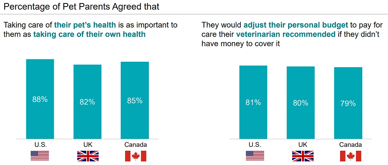3개국(미국, 영국, 캐나다)의 반려동물인들을 대상으로 한 설문 결과, 본인들의 건강보다 반려동물의 건강이 더 중요하다는 답변이 85%를 넘으며, 개인소비 예산을 줄여 반려동물치료에 쓰겠다는 답변도 80%를 넘었다. 반려동물을 가족으로 여기는 사람들이 많다는 뜻이죠.