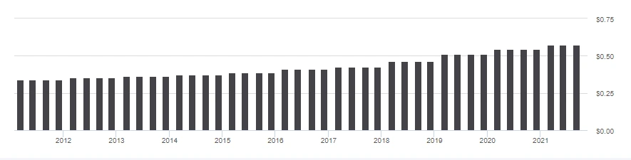 엄청난 성장성을 보여주지는 못하지만, 정말 안정적인 기업이다. 영업활동 현금흐름과 잉여현금흐름이 꾸준하며 설비투자 또한 계속해서 진행하고 있다. 특히 눈에 띄는 것은 '배당'이다. 웨이스트 매니지먼트 배당은 꾸준하게 증가했따. 10년 동안 매분기 배당을 해줬으며 지금도 증가중이다.
