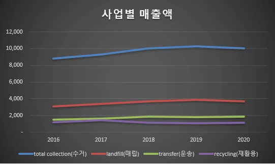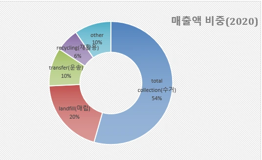 2020년 기준으로 '수거'매출이 전체의 54%를 차지하며 가장 높고, 그다음 '매립'매출이 20%를 차지하고 있다. 수거와 매립사업의 매출액이 소폭 상승하는 추세이며, 반대로 '재활용'사업은 감소하는 추세다.