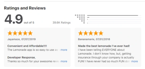 하지만 우리는 "보험금 지급은 원래 오래 걸리는 거야"라는 생각에 익숙해져 있다. 레모네이드는 이 생각을 바꾸고 싶어 했고, MZ세대들은 레모네이드의 전략에 만족감을 표현했다. 레모네이드는 NPS(소비자 만족지수)에서 70점으로 애플과 테슬라와 같은 평가를 받고 있다(참고로 보험기업 평균은 40점). 앱스토어 앱 평가에서도 4.9점의 평가를 받고 있다.