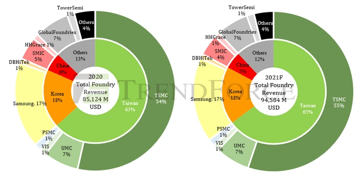 앞에서 언급했듯이 TSMC의 점유율은 전체 시장의 절반을 차지한다. 2021년을 기준으로는 55%를 점유한다.그 뒤를 삼성(17%), 대만의 UMC(7%), 미국의 글로벌파운드리(7%), 중국의 SIMC(4%)가 뒤따라 오고 있는 상황이다.