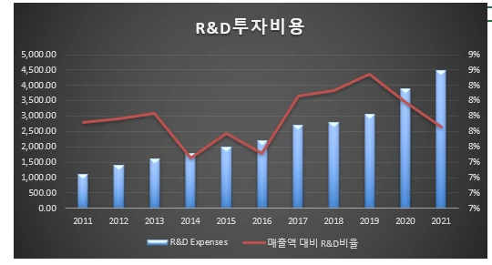 2021년 기준으로는 5조에 가까운 금액을 연구 계발비에 투자하며, 매출액 대비 평균 8%를 투자하고 있다. 오래전부터 R&D에 꾸준히 투자해왔기에, 경쟁자들과 기술적 격차를 벌릴 수 있었던 것이다.