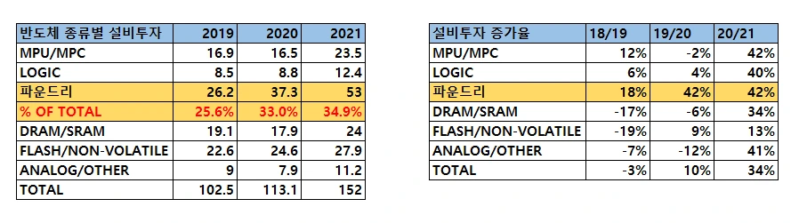 반도체 전체 시장으로 봐도 파운드리 사업의 설비투자는 큰 비중을 차지한다. 전체 반도체 설비투자에 차지하는 비율이 2019년 25.6%에서 2021년 35%까지 상승했다. 18년 이후로는 연평균 34%가 상승했다. TSMC의 2020~2022년 3년 설비투자액이 이전 9년을 합한 것보다 많다.