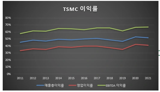 매출만큼 이익률은 매우 중요하다. 제조업 기반 기업들은 보통 이익률이 낮다. 한국의 제조업 평균 영업이익률은 5%에 불과하다. 하지만 TSMC는 다르다. 매출총익률은 50%를 상회하며, 영업이익률(EBIT)은 2021년 42%를 보여줬다.