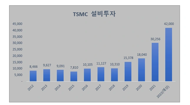 파운드리 사업에서 설비투자는 매우 중요한 요소이다. 하지만 천문학적인 돈이 들어간다. 흔히 쩐의 전쟁으로 불리는 이유다. TSMC는 2021년 설비투자에 약 300억 달러(한화 35조)를 썼으며, 내년에는 45조를 투자할 예정이다.