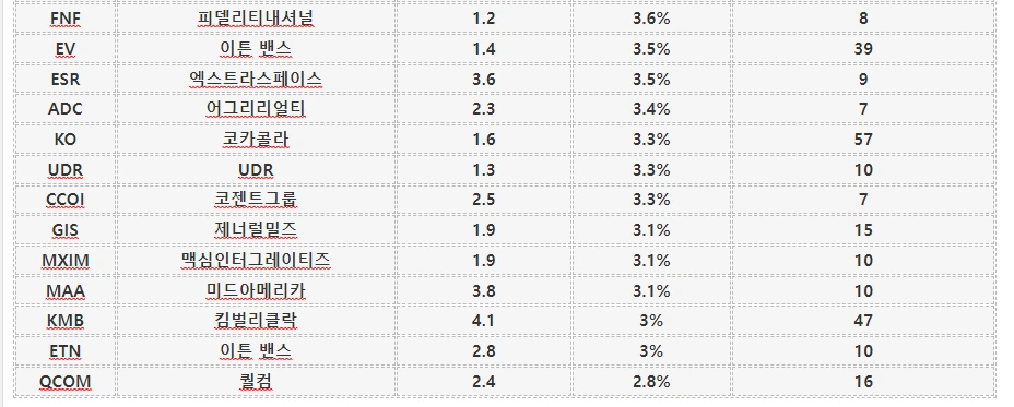 위에서 소개드린 미국 배당주 50개 이외에 다음의 기업들도 추천드립니다. 미국 대표적인 배당주 입니다. 미국은 분기배당, 월배당등 배당금을 엄청 잘 주기로 유명하죠. 국내 배당주와는 달리 말이죠..