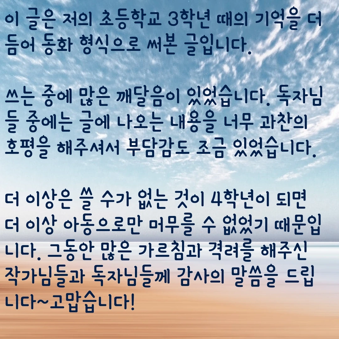지나던 6학년 형이 우리를 말리고 집에 빨리가라고 호통을 친다. 나는 손바닥으로 코피를 쓱 닦고 호야와 갔다. 역시 호야는 내편이다. 집에 오니 엄마가 옷이 흙깡태기가 된 나를 멈칫 세운다.
