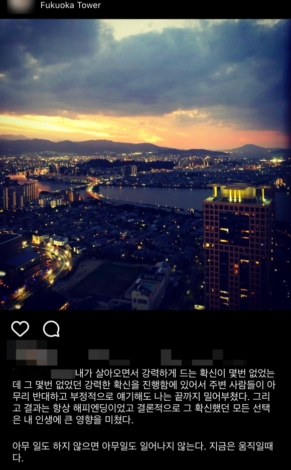 여행 간 내내 그녀가 생각이 났고 연락을 했지만 답장은 항상 세 시간 뒤에나 겨우 왔다. 지금도 생각하면 그때 마음이 참 힘들었다. 해가 뉘엿뉘엿 질 무렵 나는 후쿠오카 타워에 갔었다. 일본은 높은 건물들이 잘 없었기에 후쿠오카 타워에서는 펼쳐진 도시의 모습을 한눈에 볼 수 있었다. 나는 후쿠오카 타워 한편에 자리를 잡고 앉아 나얼이 부른 '언젠가는'을 반복해 듣고 있었다. 왠지 모를 눈물이 났고 그때 나는 인스타그램에 글을 남겼다.
