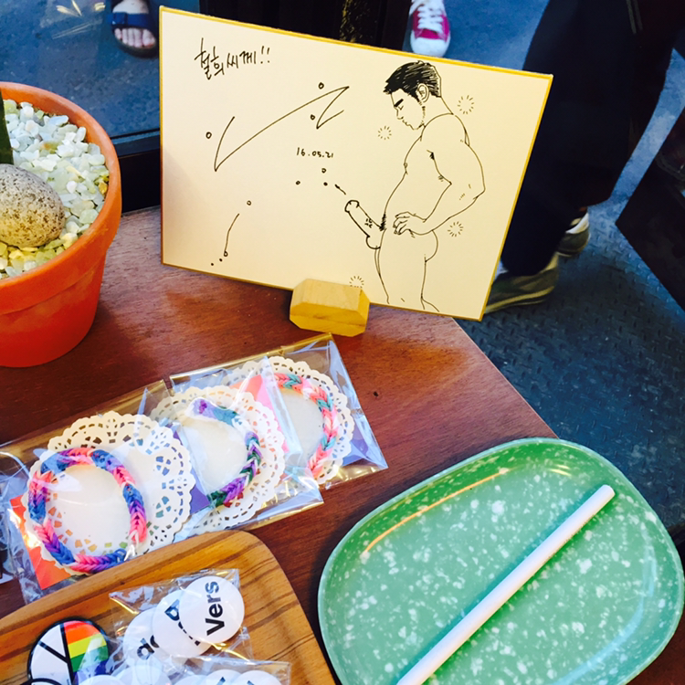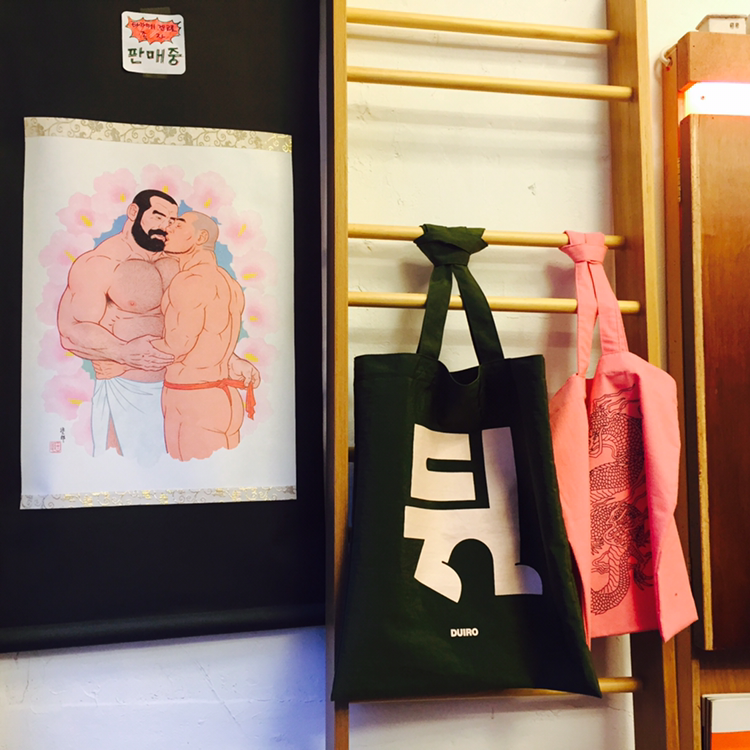 약 9개월 가까이 운영하면서 가장 많이 팔린 베스트셀러라면 <DUIRO(뒤로)> 라는 잡지이다. 그리고 레즈비언 웹디자이너가 만든 <도쿄일인생활>이라는 요리책이 있다. LGBT와의 관련성보다 일반 사람들도 다 좋아하는 책으로 나온 지 며칠 만에 완판 됐다. 한 달 동안 한권만 판다면 하드코어 한 게이 만화를 그리는 타카메 겐고로 작가의 만화책을 고르고 싶다. 서점 한 켠에도 걸려 있는 족자 그림도 같은 작가의 작품이다. 게이 매거진 <DUIRO(뒤로)>의 텀블벅 리워드로 제작한 것이다. 한국 독자만을 위한 족자로 그림 속에 특별히 무궁화 그림이 그려져 있다.