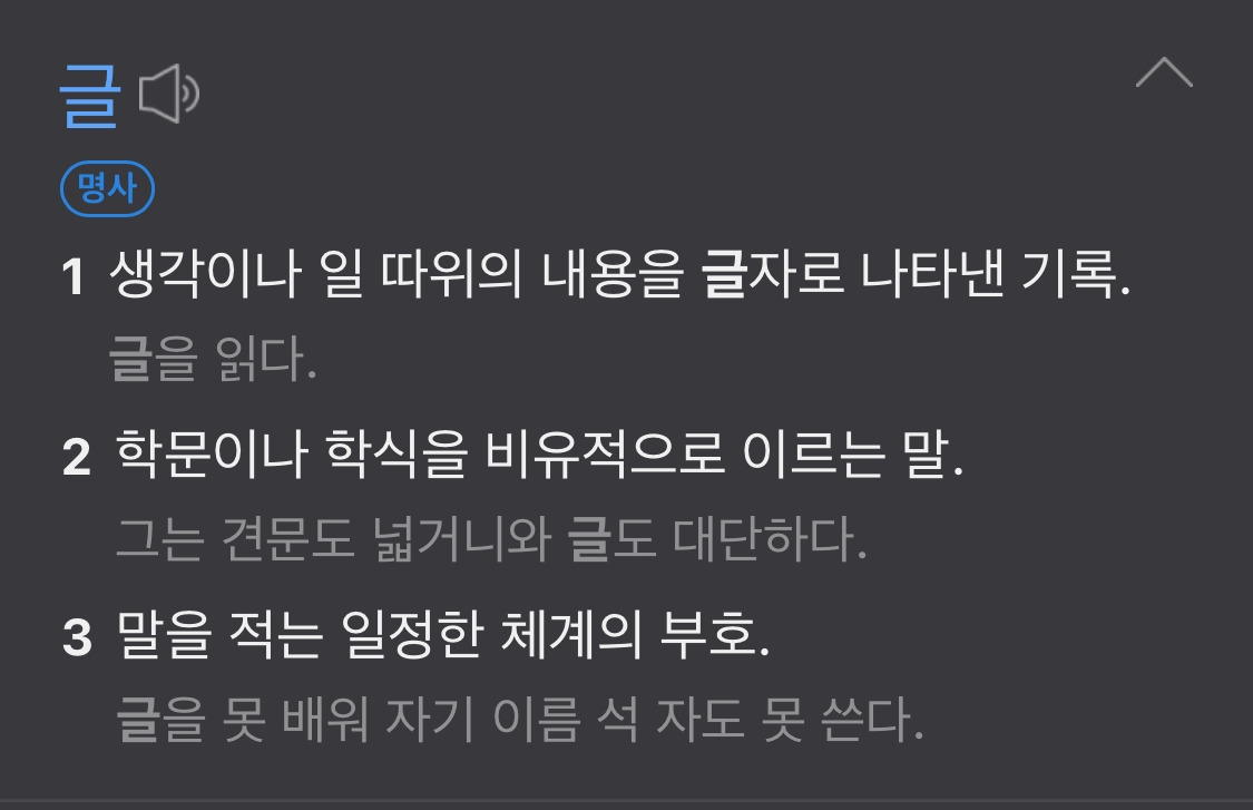 사전에 “글”의 정의를 찾아봤다. 뭐 누구나 예상한 대로 글이란 생각이나 일 따위를 글자로 나타낸 기록이다. 당연하게도 “기록”이 가장 핵심이겠지. 그걸 위해 내가 갑자기 밤 12시에 스마트폰을 보고 누워있다가 벌떡 일어난 것처럼.