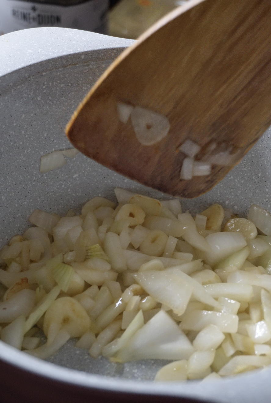 다진 마늘과 잘게 썬 양파를 넣고 향이 올라올 때까지 볶습니다.