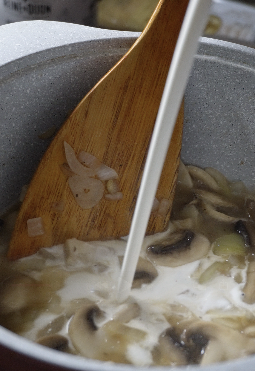 치킨스톡과 물이 끓기 시작하면 생크림을 넣고 걸쭉해질 때까지 졸입니다.