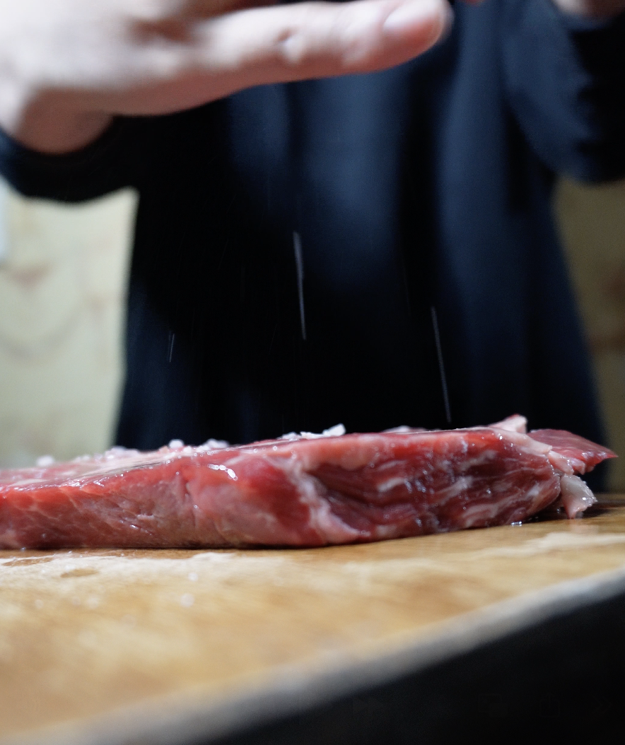 스테이크를 소금, 후추, 로즈마리, 올리브유에 재워 30분 이상 실온에서 숙성시킵니다.