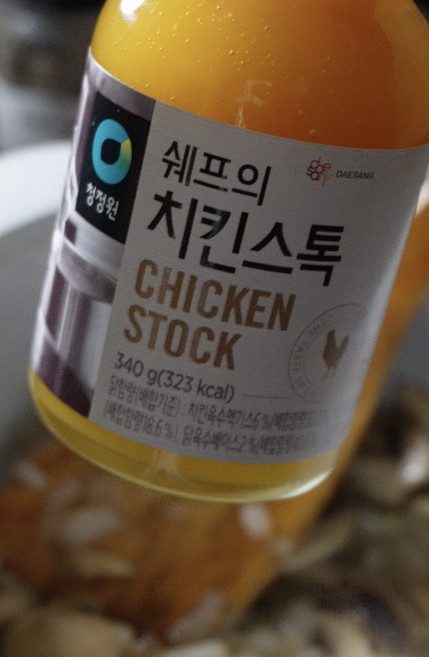 버섯이 노릇하게 볶아지면, 여기에 치킨스톡과 물을 넣어 국물 베이스를 만들어줍니다.