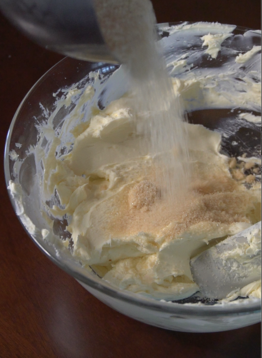 크림치즈가 어느 정도 부드러워지면 설탕을 넣고 다시 한번 잘 섞어줍니다.