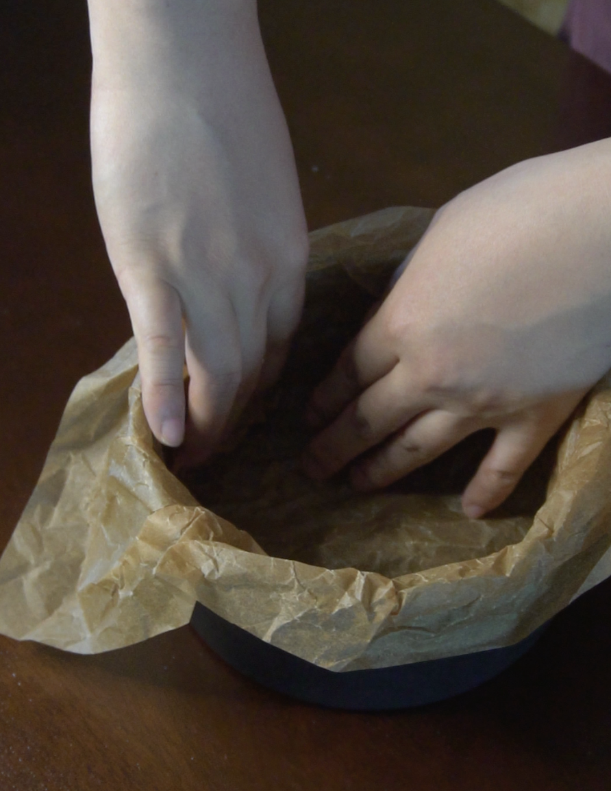 1호 케이크 팬에 유산지를 한 번 구겨서 깔아 준비한 후 반죽을 부어주세요.