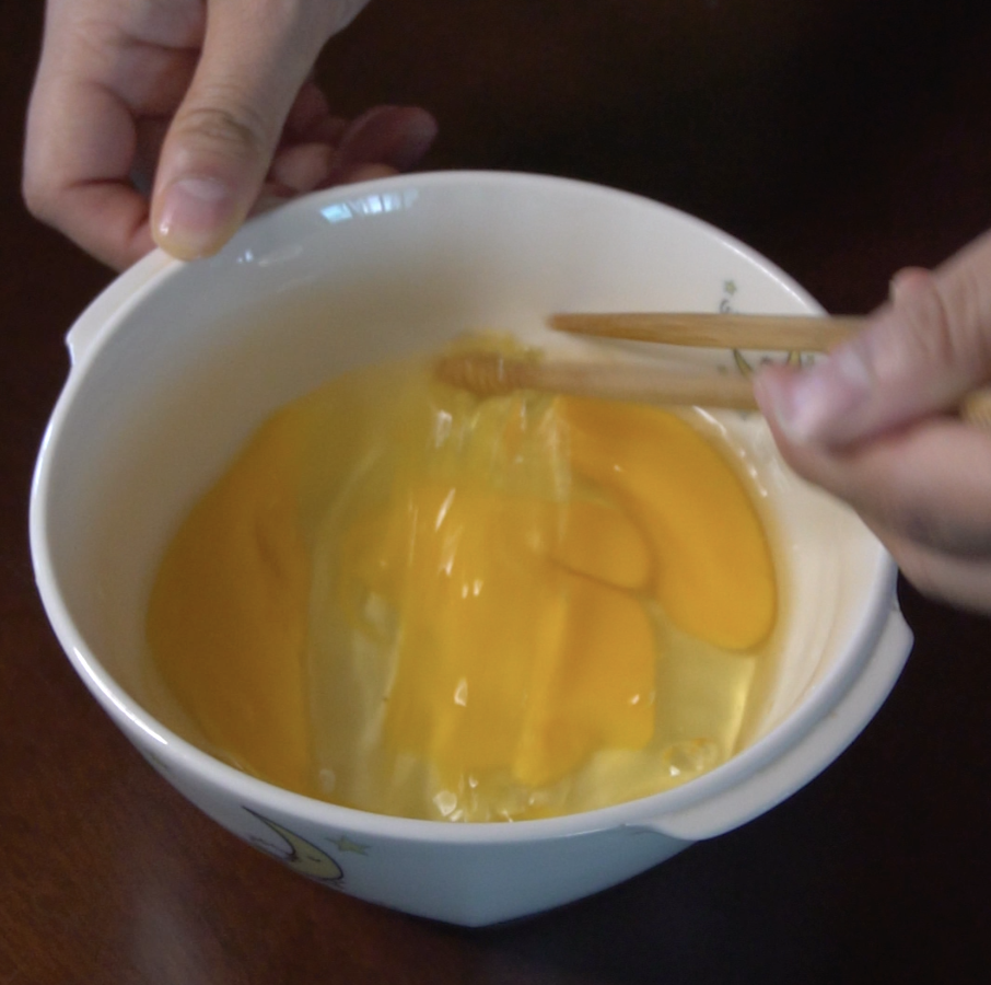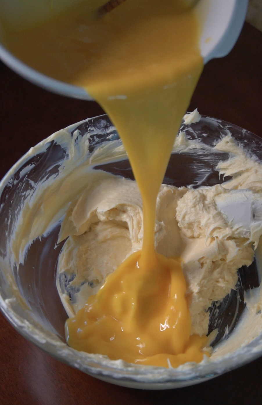 설탕 알갱이가 보이지 않으면, 계란을 두 번에 나누어 넣어가며 섞어줍니다.