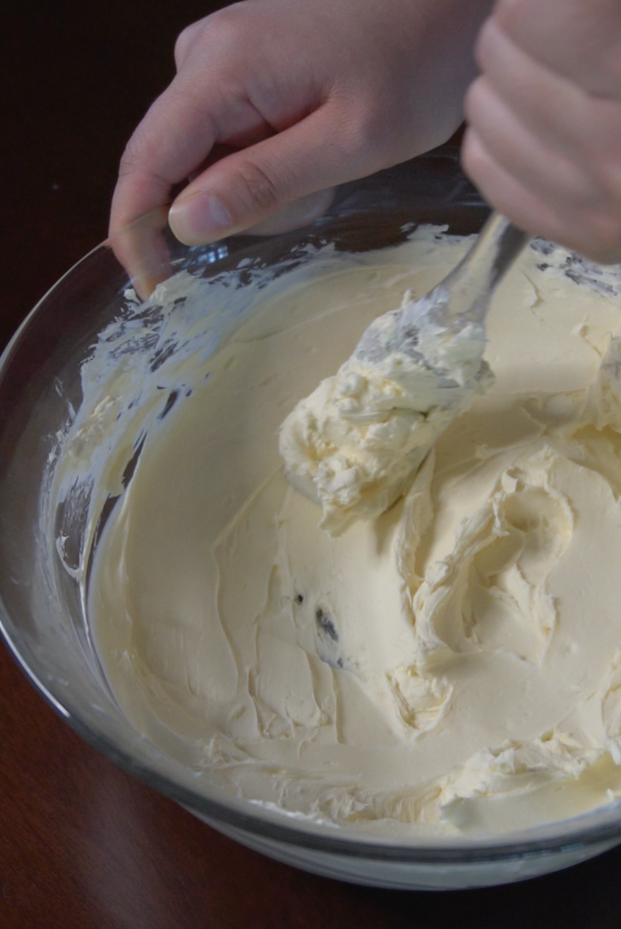 크림치즈를 계량한 후 주걱이나 휘핑기를 사용해 부드럽게 풀어주세요.