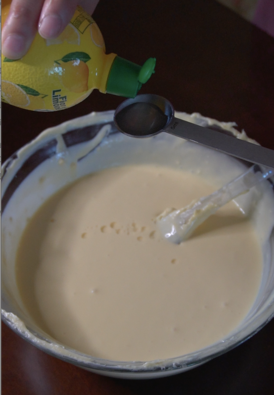 이어서 생크림과 레몬즙을 넣고 골고루 섞어줍니다.