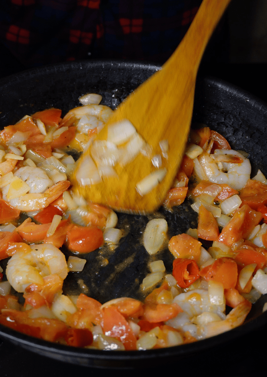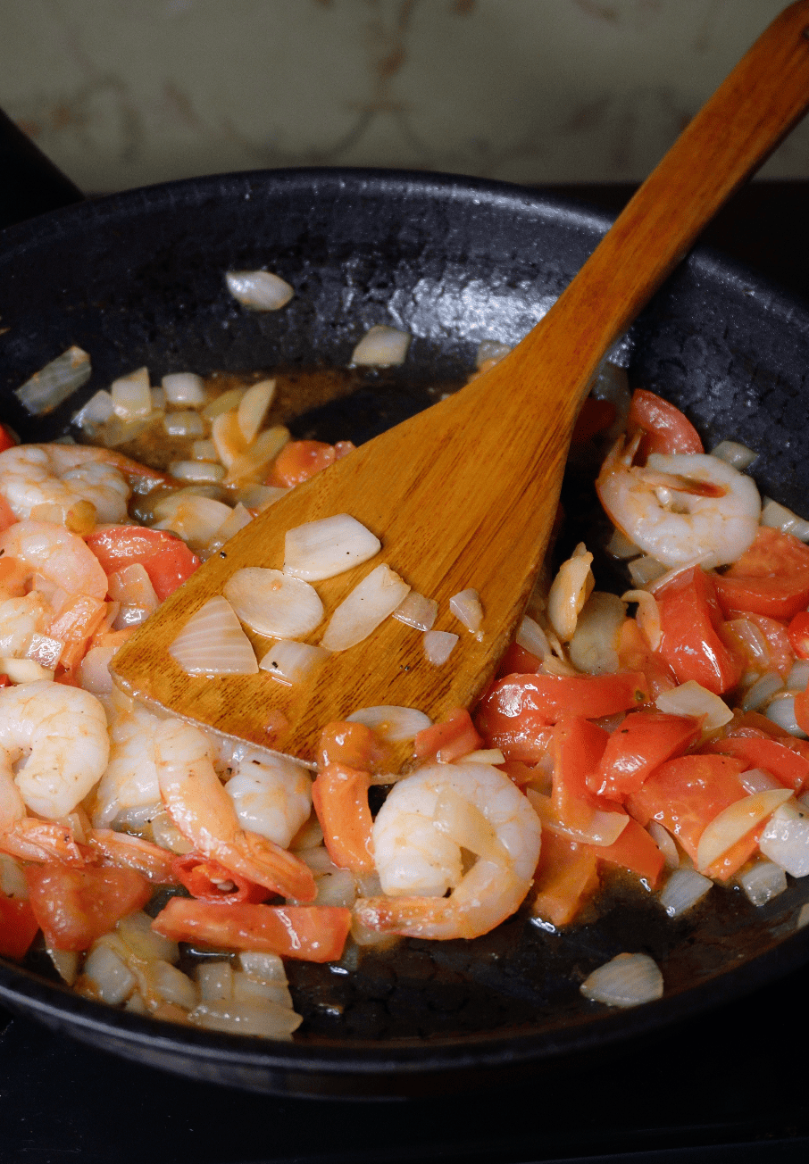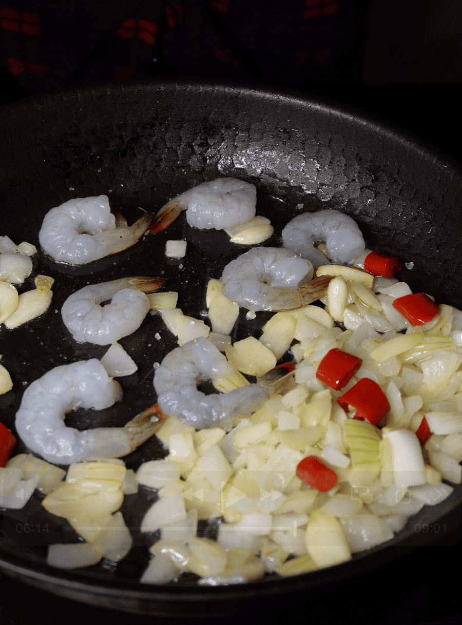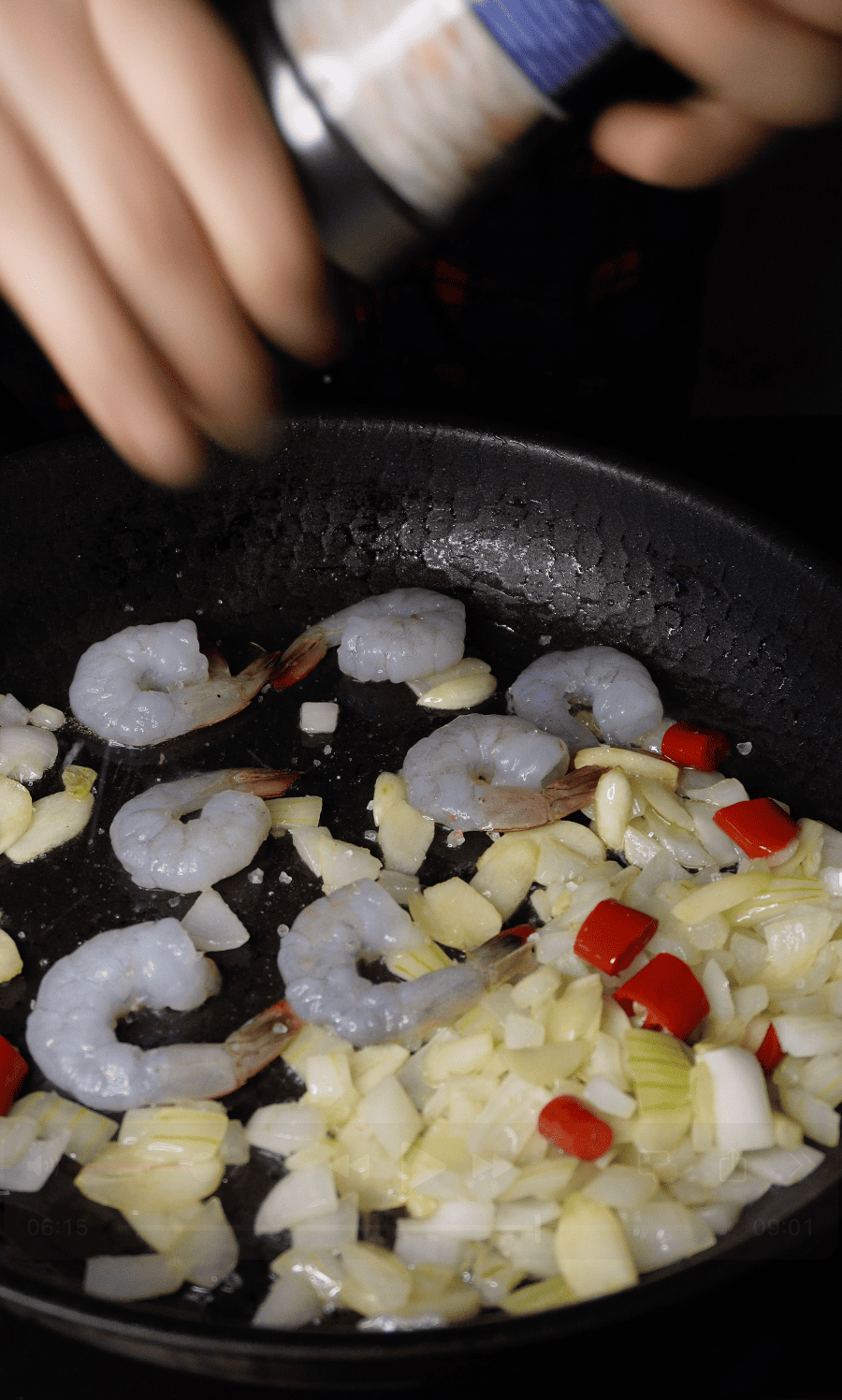 마늘과 양파의 색이 살짝 변하고 향이 올라오면, 새우를 넣고 겉면만 살짝 익혀주세요.