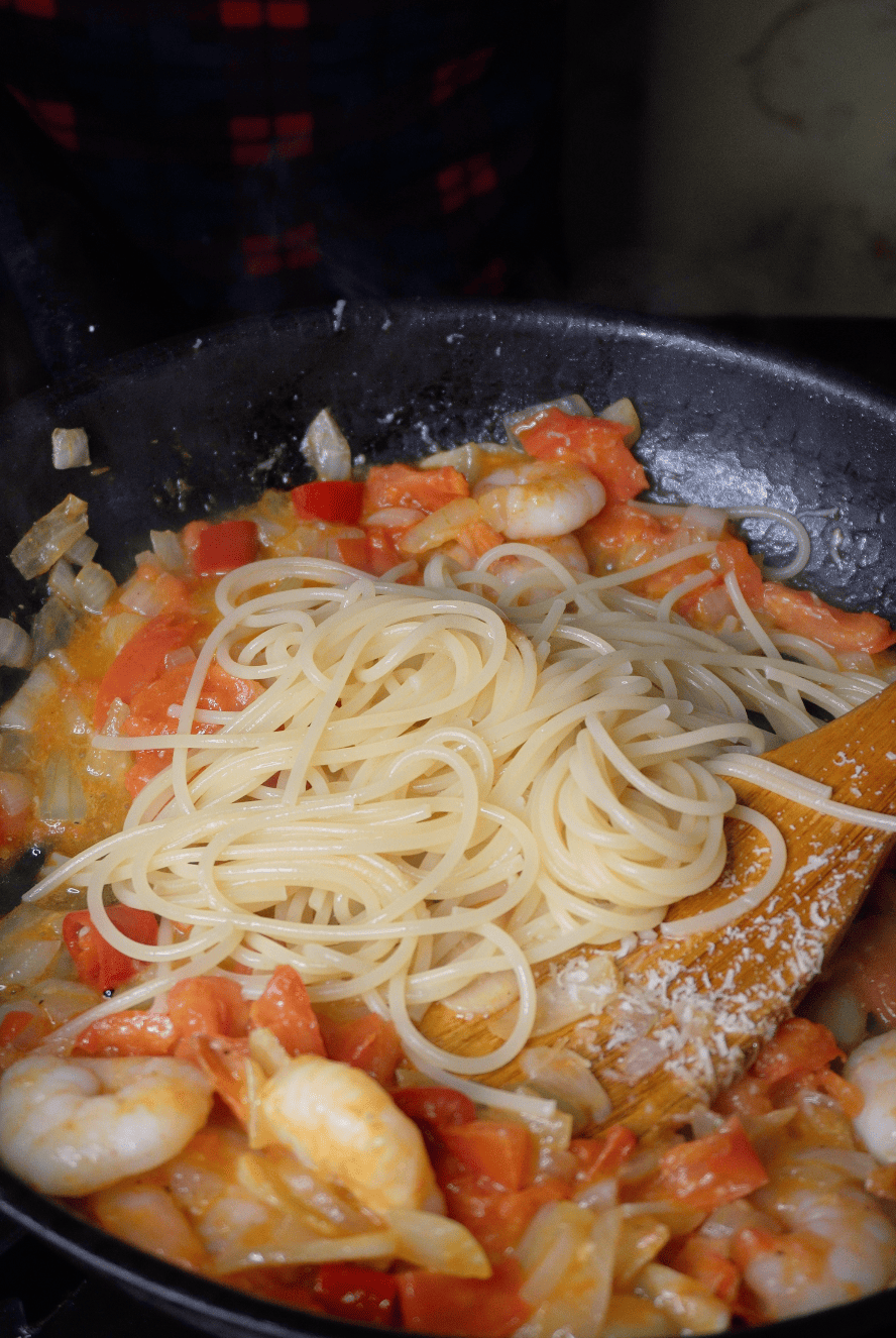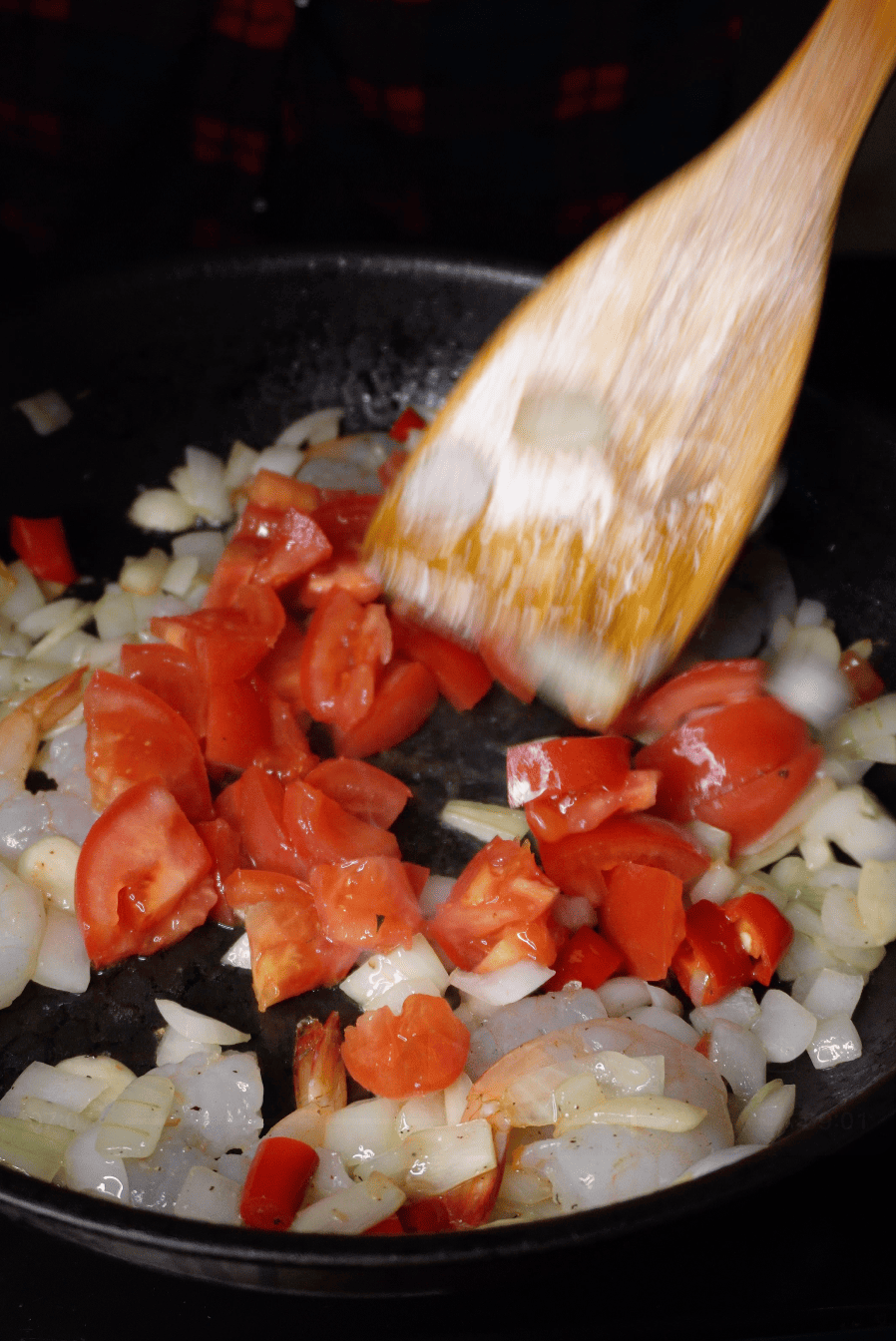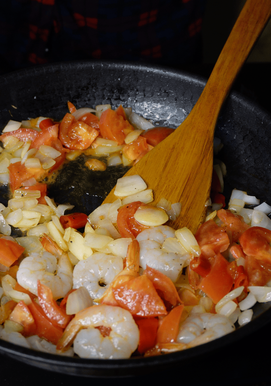 마늘과 양파의 색이 살짝 변하고 향이 올라오면, 새우를 넣고 겉면만 살짝 익혀주세요.
