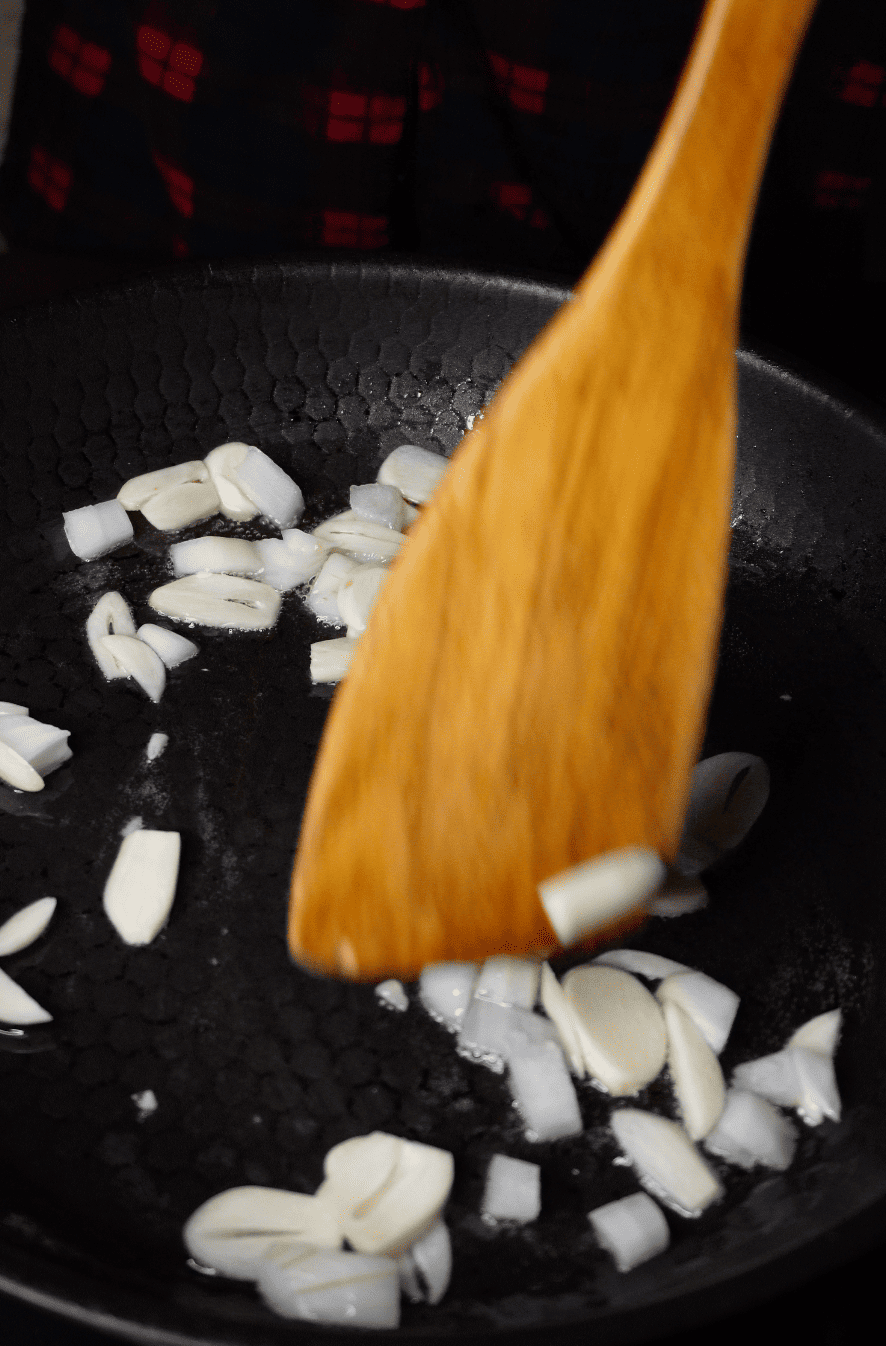 마늘은 편으로 썰고, 느끼함 잡아주는 청양고추는 송송 썰어 준비해 주세요.