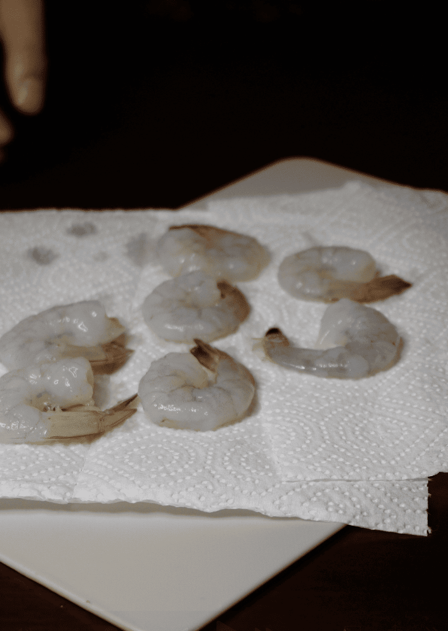 해동한 새우는 키친타월로 꾹꾹 눌러 물기를 제거합니다.