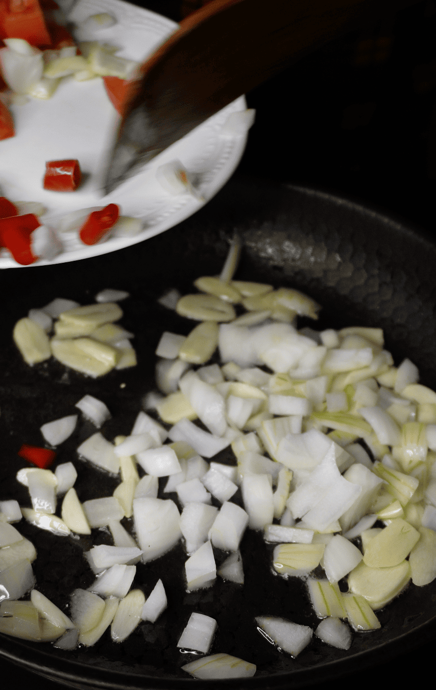 팬에 올리브오일을 두르고, 마늘 → 양파 → 청양고추 순으로 볶아주세요.