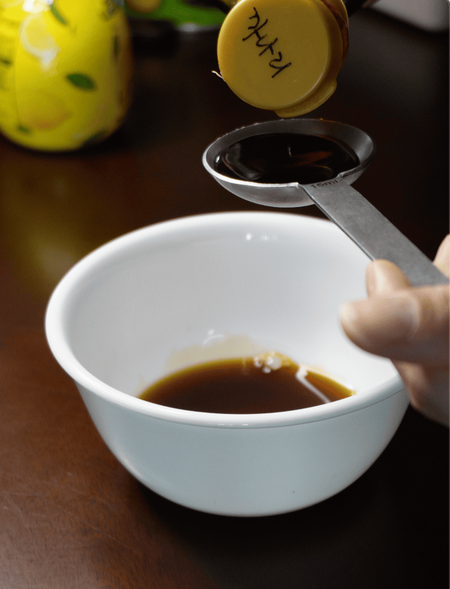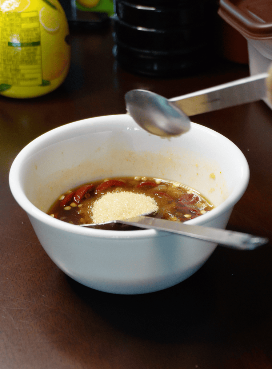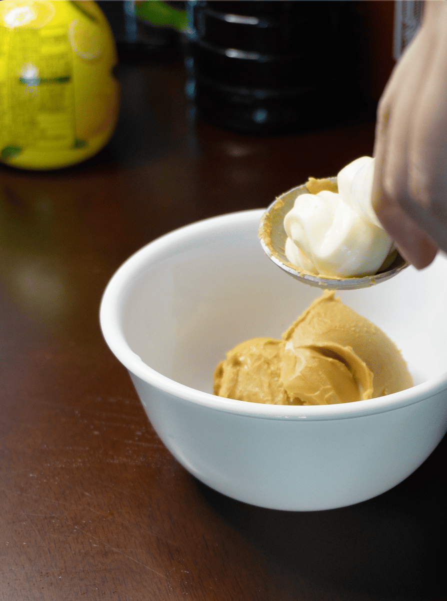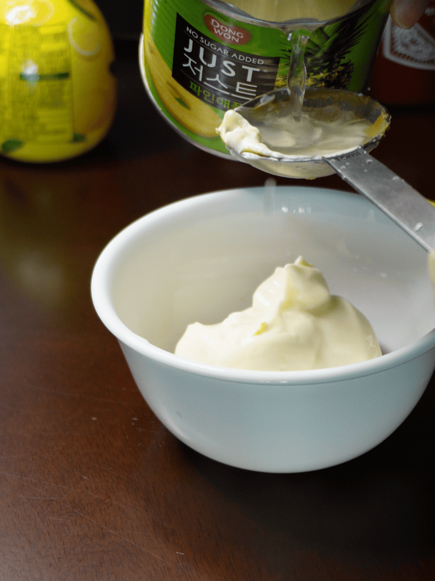 땅콩소스는 뻑뻑하기 때문에 처음에 마요네즈를 먼저 섞어주고, 파인애플 국물을 조금씩 넣어가며 원하는 농도로 조절하세요.