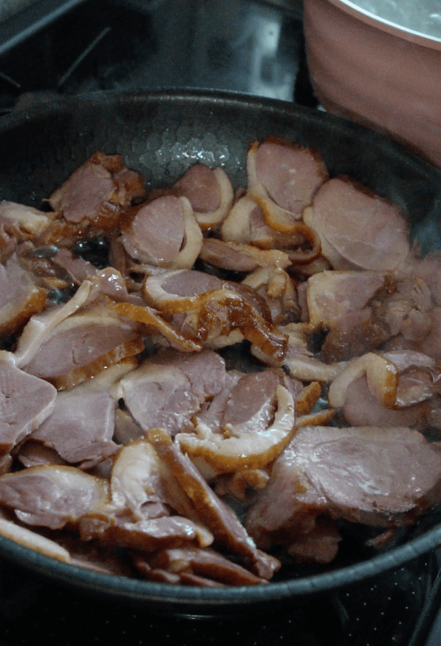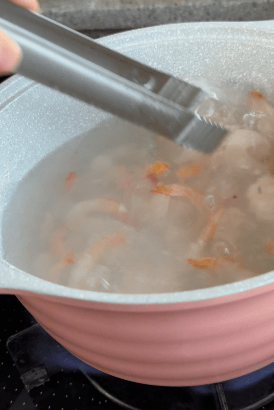 훈제 오리고기 굽고 새우도 데쳐줍니다.