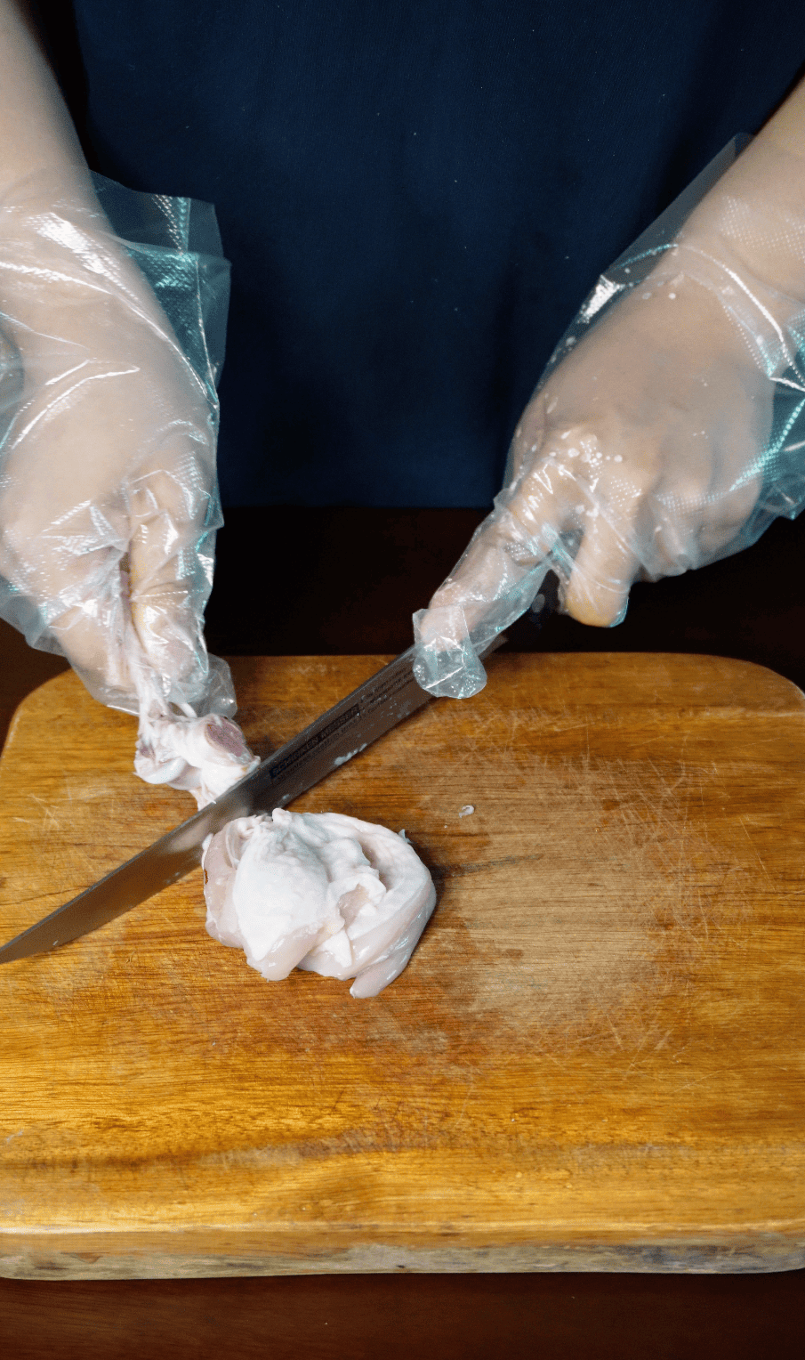 1. 닭다리의 가장 얇은 쪽(아랫부분)을 기준으로 칼로 원형으로 한 바퀴 돌며 깊게 칼집을 넣어주세요.