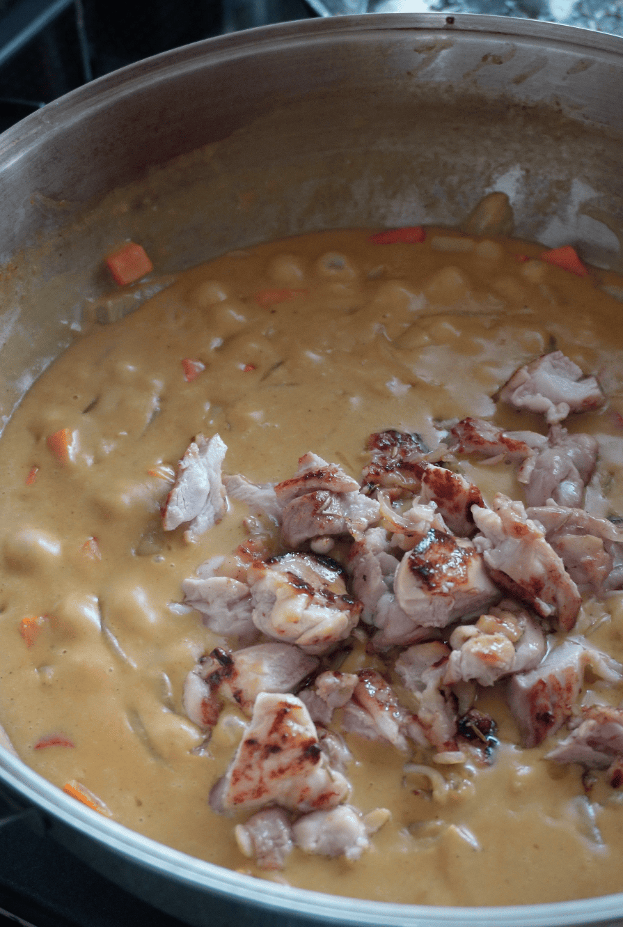 카레가 거의 다 익어갈 때쯤, 노릇하게 구워진 닭고기를 잘라 넣고 함께 조리해 주세요.