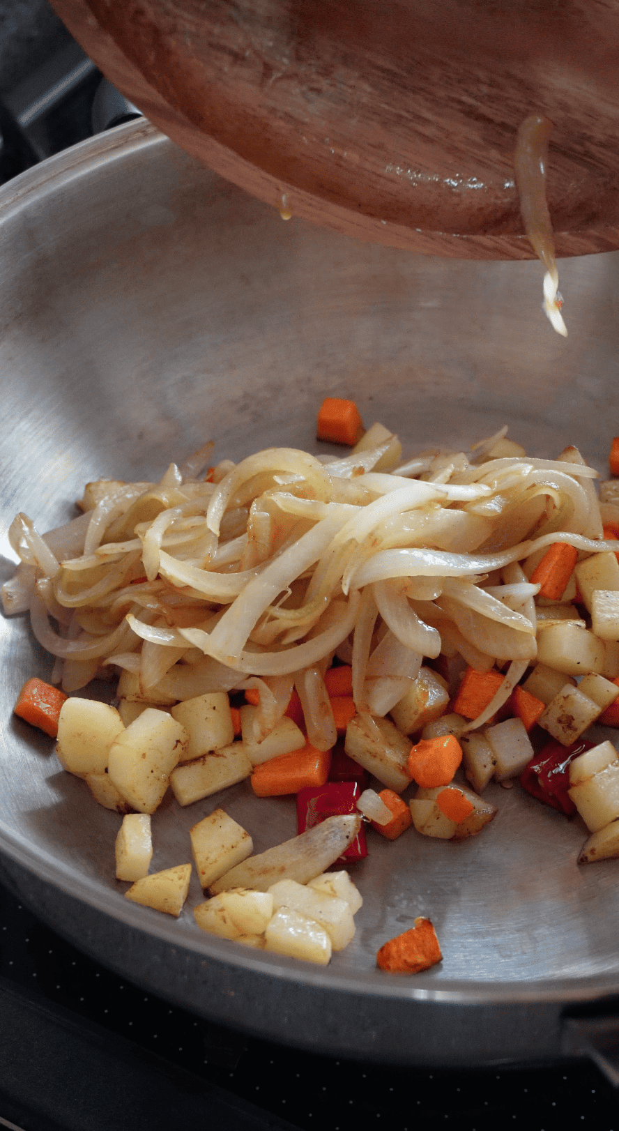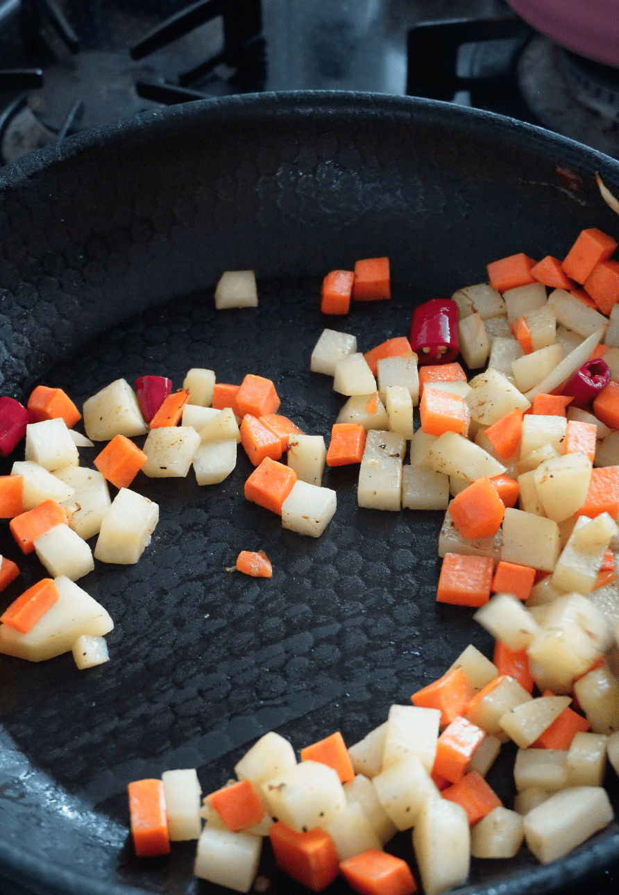 팬에 당근과 감자, 청양고추를 넣고 노릇하게 볶아줍니다. 중간중간 소금과 후추로 간을 맞춰주세요.