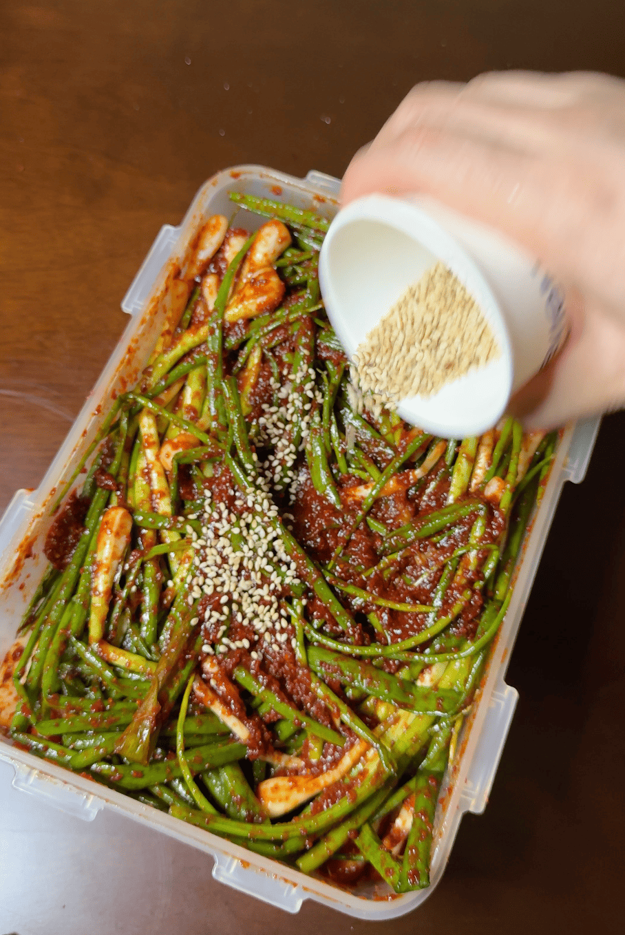 양념이 잘 묻었다면 물엿을 넣어 한 번 더 살살 버무려 줍니다.