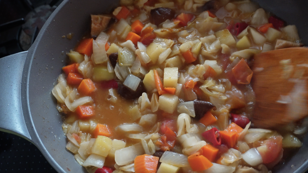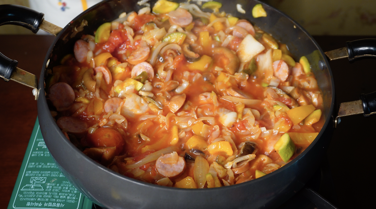 야채에서 수분이 꽤 많이 나오니, 국물이 너무 많아지지 않도록 충분히 졸여 주세요.