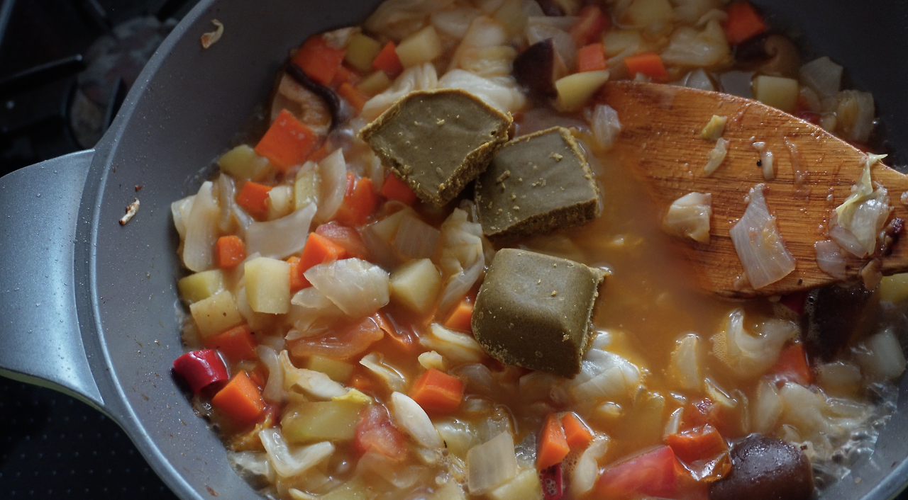 야채들이 숨이 죽으면 물과 카레를 넣고 자작하게 졸여 주세요.