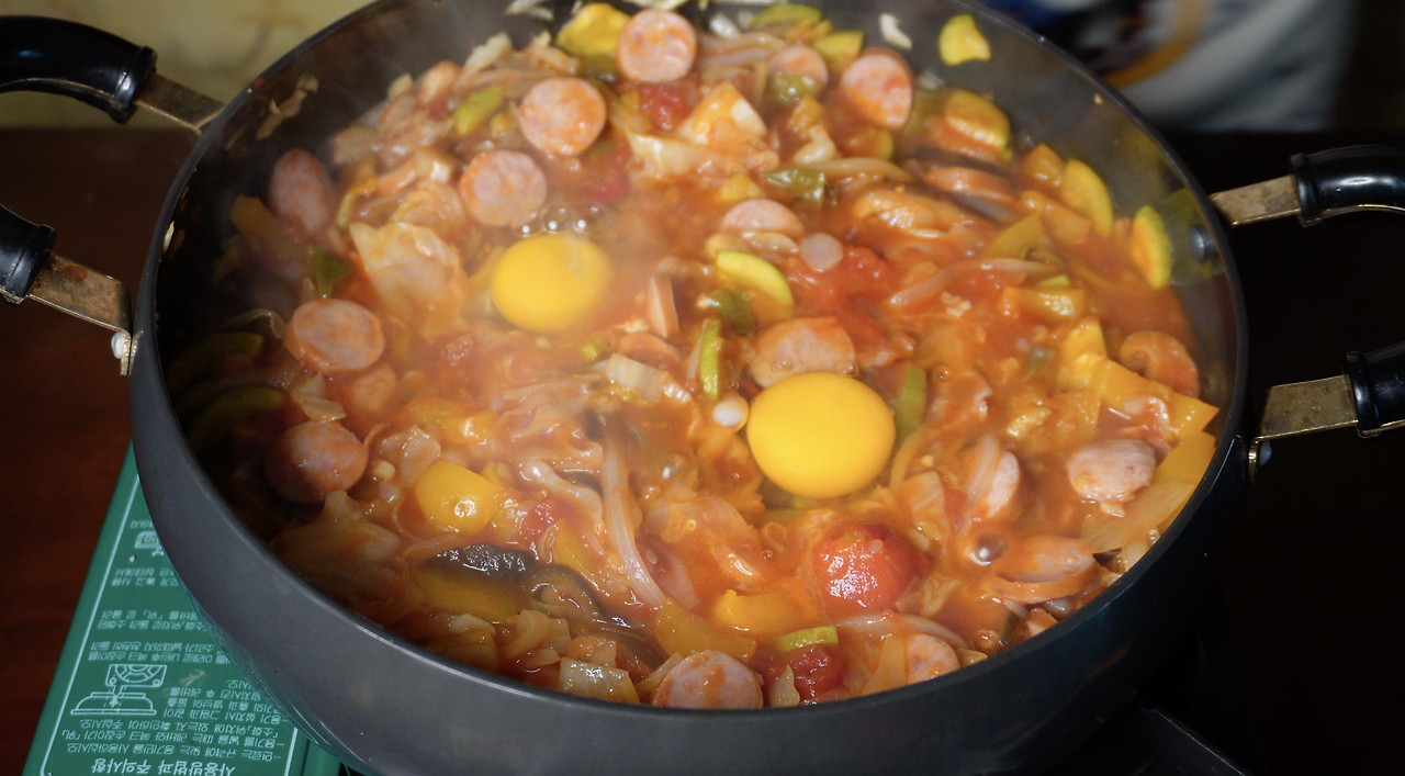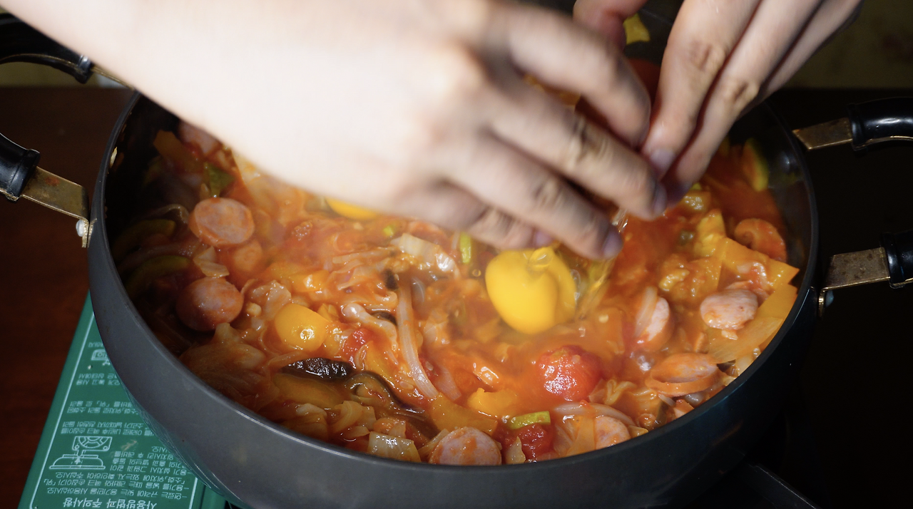 소스가 어느 정도 졸아들면 가운데 공간을 만들어 계란을 깨 넣어주세요.