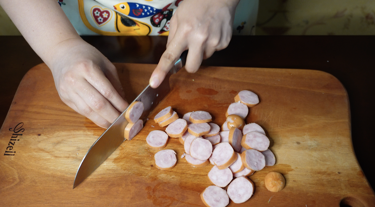 야채들 숨이 죽으면 소시지를 넣어 함께 볶아줍니다.